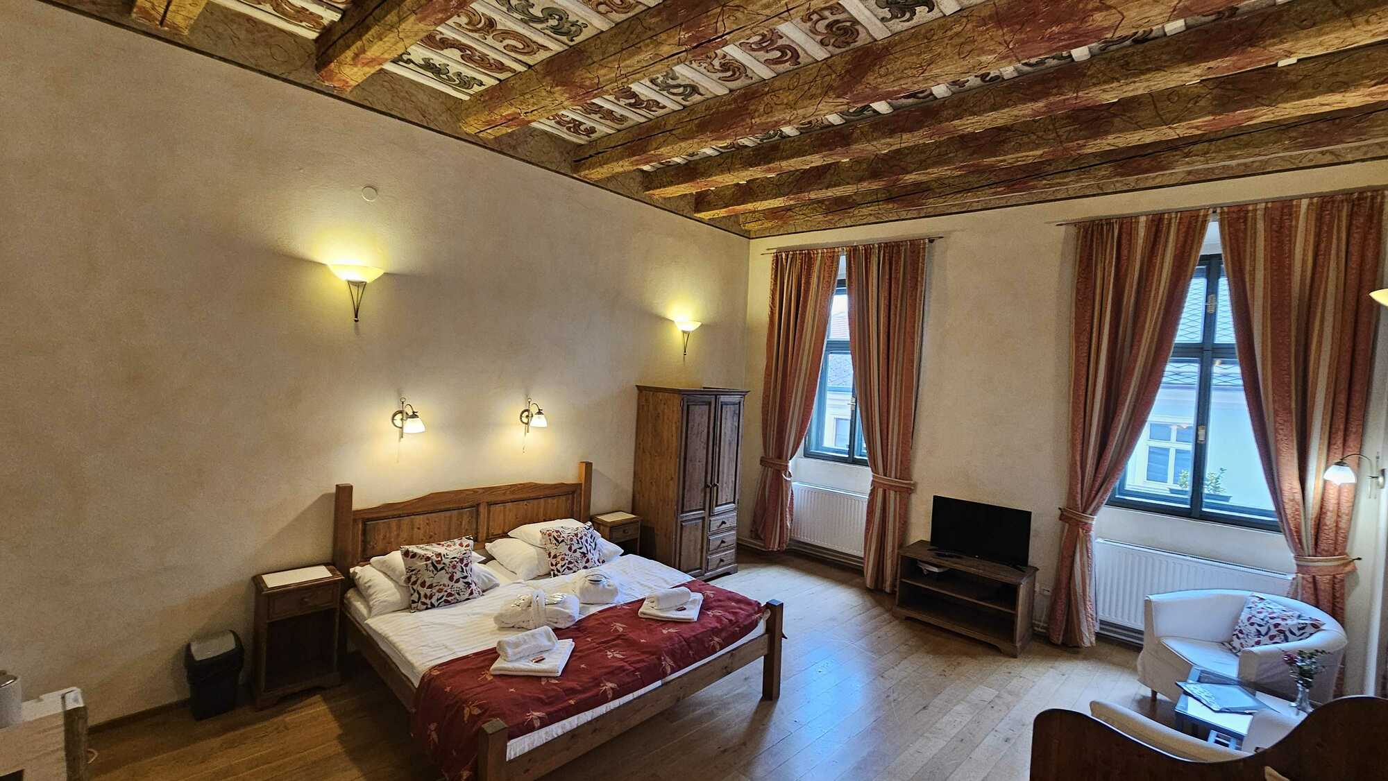 Das Superior Dreibettzimmer bietet Unterkunft in einem historischen Zimmer, verfügt über ein bequemes Doppelbett für 2 Personen und ein Einzelbett, das auch als Sofa genutzt werden kann. Es gibt auch zusätzliche Kissen, Bademäntel und Hausschuhe. Das Zimmer verfügt über einen Kühlschrank, Minibar, Wasserkocher, Kaffee- und Teezubereitungsmöglichkeiten, TV, Telefon zur Verbindung mit der Rezeption, WLAN, Ventilator, Badezimmer mit Dusche und WC. Hotelkosmetik der Marke Botanica – Duschgel & Shampoo, Körperlotion, Seife.